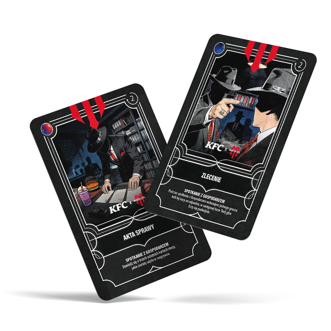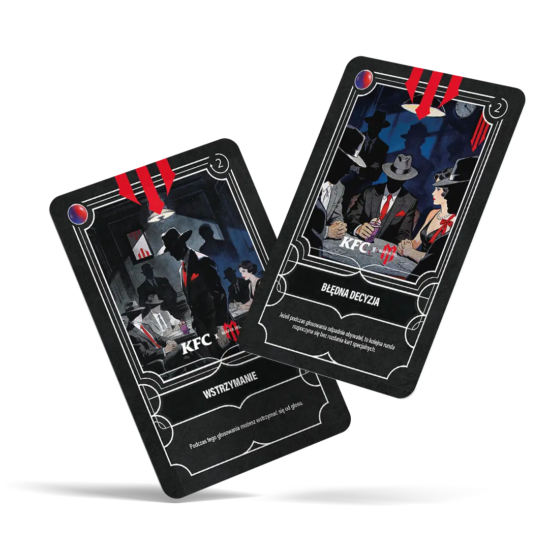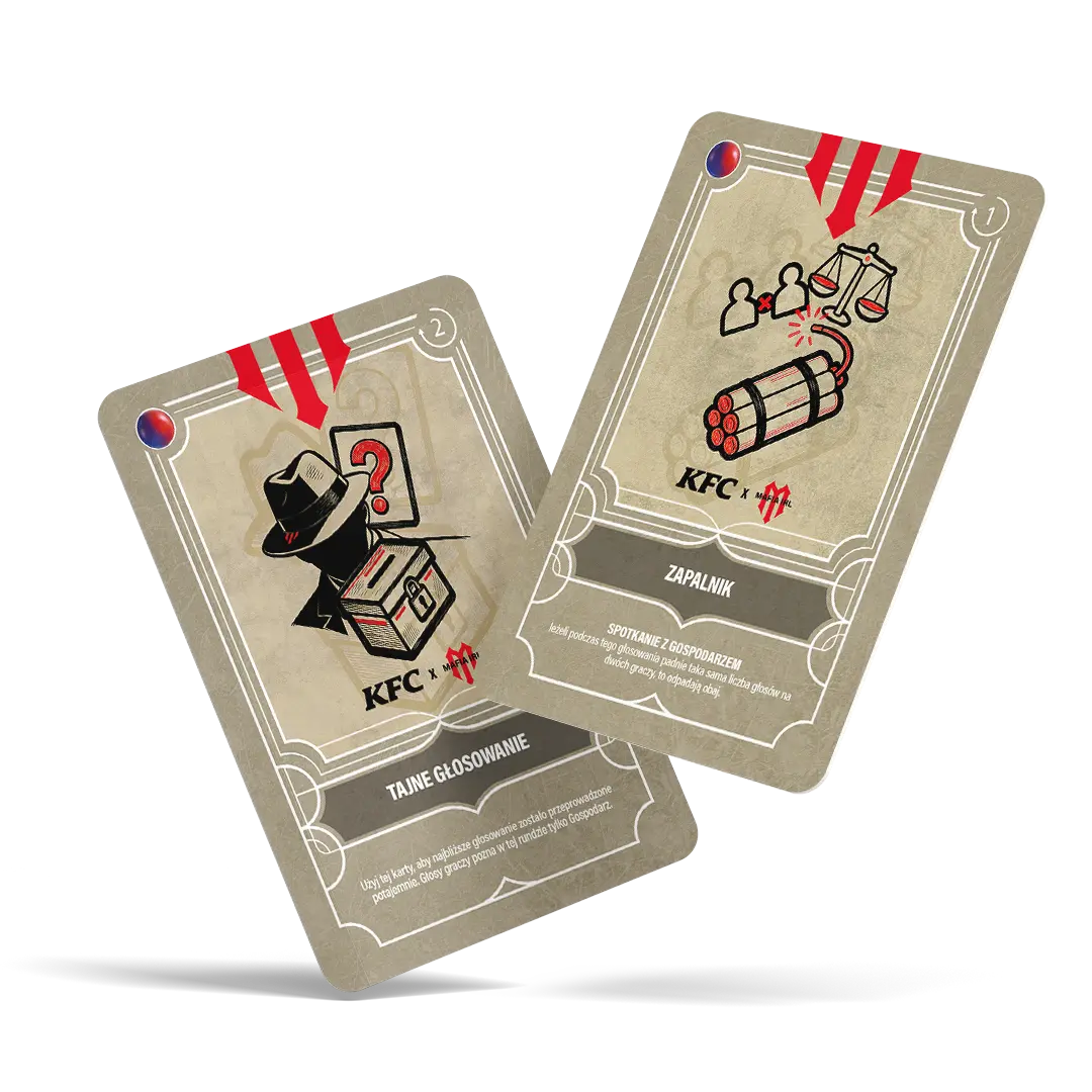Mafia IRL × KFC to specjalna, limitowana edycja kultowej gry towarzyskiej, stworzona z myślą o szybkiej rozgrywce, napięciu i nieprzewidywalnych zwrotach akcji. To idealna gra na spotkania ze znajomymi. Przy stole, w domu lub w dowolnym miejscu, gdzie liczy się blef, obserwacja i wspólna zabawa.